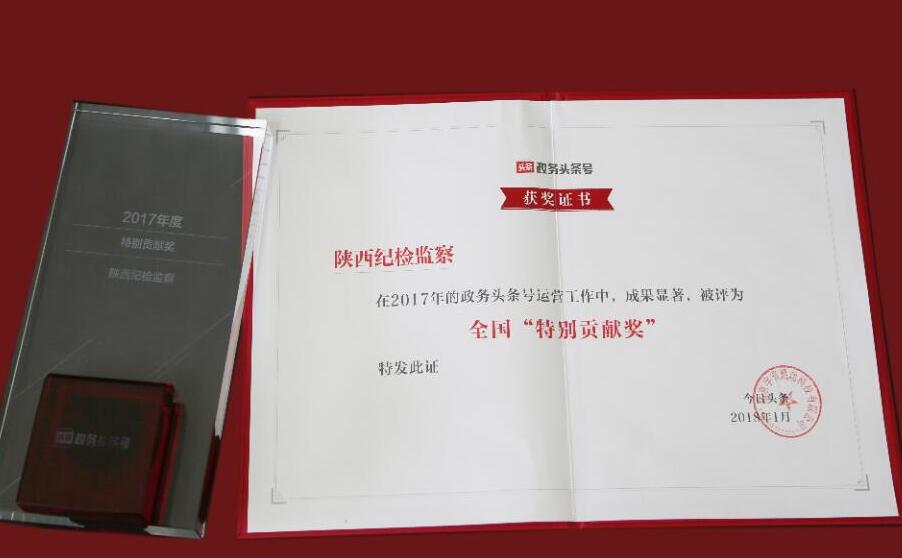 近日,“陕西纪检监察”政务头条号荣获《今日头条》2017年度“特别贡献奖”。据了解,全国已有超过70000个政务机构入驻《今日头条》,开通了政务头条号,“陕西纪检监察”头条号成为全国300个获奖的政务头条号之一。