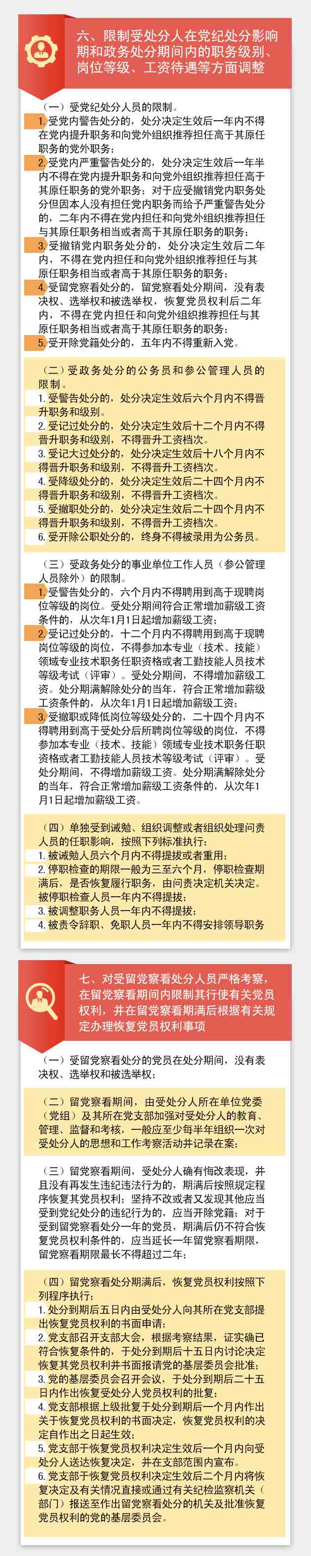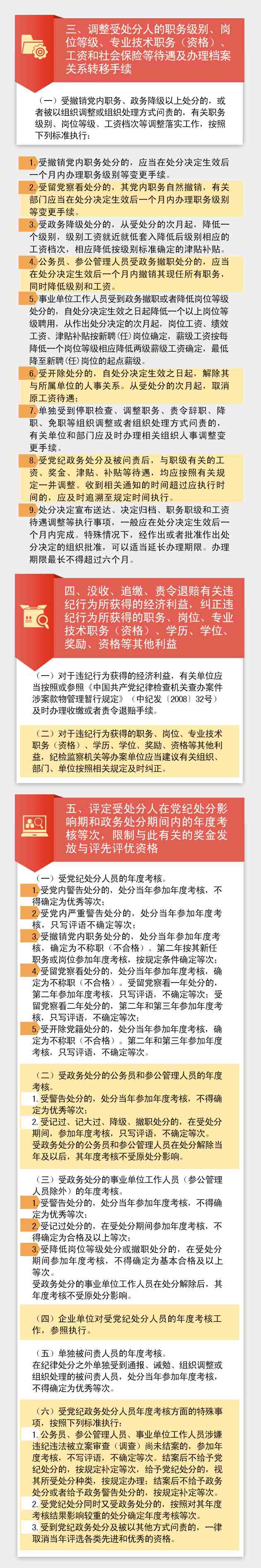 这张长图主要涉及十方面事项:处分决定的宣布、送达;将处分决定材料归入受处分人的组织人事档案;调整受处分人的职务级别、岗位等级、专业技术职务(资格)、工资和社会保险等待遇及办理档案关系转移手续;没收、追缴、责令退赔有关违纪行为所获得的经济利益,纠正违纪行为所获得的职务、岗位、专业技术职务(资格)、学历、学位、奖励、资格等其他利益;评定受处分人在党纪处分影响期和政务处分期间内的年度考核等次,限制与此有关的奖金发放与评先评优资格;限制受处分人在党纪处分影响期和政务处分期间内的职务级别、岗位等级、工资待遇等方面调整;对受留党察看处分人员严格考察,在留党察看期间内限制其行使有关党员权利,并在留党察看期满后根据有关规定办理恢复党员权利事项;办理对事业单位工作人员政务处分的提前解除;落实有关纪律检查建议和监察建议;其他需要执行的事项。