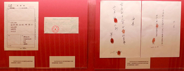 习近平总书记2012年考察河北省阜平县时的晚餐菜单、2014年考察河南省兰考县时的餐费收据、2015年在梁家河原大队党支部书记梁玉明家的午餐费用收条(从左到右)