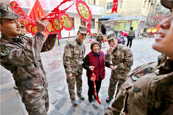元旦前夕,东部战区某旅学雷锋模范班的官兵们来到驻地敬老院,为孤寡老人打扫卫生、贴福字、挂灯笼,共同迎接一个欢乐的新春。