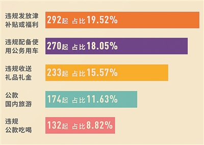 从违纪类型来看,违规发放津补贴或福利、违规配备使用公务用车、违规收送礼品礼金、公款国内旅游、违规公款吃喝等问题比重仍然较大,这5类问题占通报问题总数的73.6%。其中,违规发放津补贴或福利问题292起,占19.52%;违规配备使用公务用车问题270起,占18.05%;违规收送礼品礼金233起,占15.57%;公款国内旅游问题174起,占11.63%;违规公款吃喝问题132起,占8.82%。