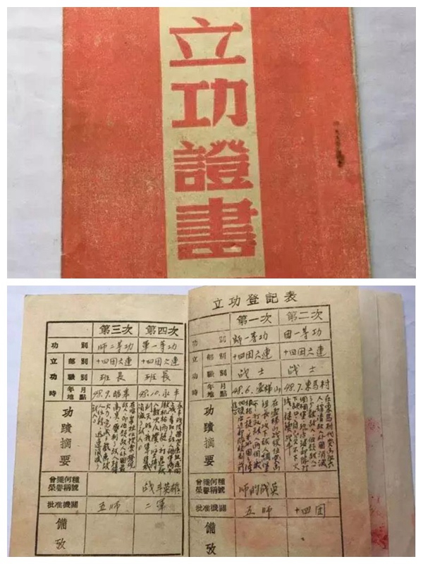 张富清的立功证书及内页登记表