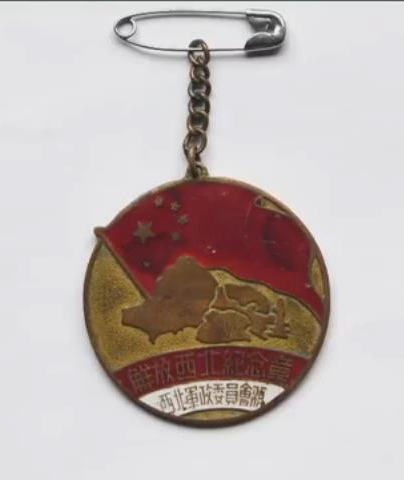 “解放西北纪念章”,章体为圆形金地,主题图案为西北五省地图上高高飘扬着五星红旗,象征人民政权在西北五省取得胜利。
