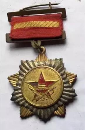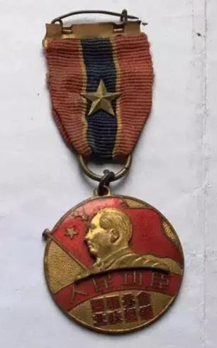 “人民功臣”奖章,为圆形铜质镀金。正面上方为金色毛泽东主席肖像,背衬五星红旗,下方横写“人民功臣”,落款为“西北军政委员会颁”。