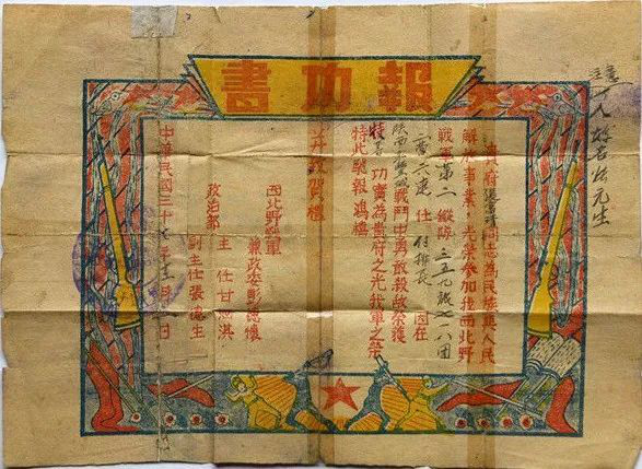这份西北野战军的报功书,记录着张富清荣获特等功的始末:“贵府张富清同志,为民族与人民解放事业,光荣参加我西北野战军第二纵队三五九旅七一八团二营六连,任副排长。因在陕西永丰城战斗中勇敢杀敌,荣获特等功,实为贵府之光,我军之荣。特此驰报鸿禧,并致贺礼。”永丰战役后彭德怀握着他的手说:“你在永丰战役表现突出,立下了大功。”