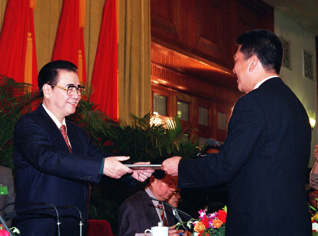 1998年5月5日,全国人民代表大会澳门特别行政区筹备委员会在北京人民大会堂宣告成立并举行第一次全体会议。这是李鹏同志为筹备委员会副主任委员何厚铧颁发任命书。新华社记者 鞠鹏 摄
