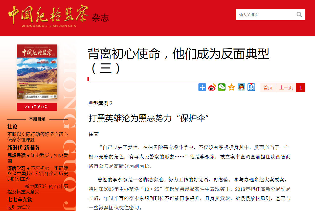 日前,《中国纪检监察》杂志第17期“警示剖析”栏目刊发商洛典型案例《打黑英雄沦为黑恶势力“保护伞”》,全文如下: