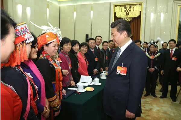 3月8日,中共中央总书记、国家主席、中央军委主席习近平参加十二届全国人大三次会议广西代表团的审议。这是习近平来到女代表中间,同她们亲切交谈,代表党中央、国务院,向广大妇女代表、妇女委员及全国各界妇女同胞,致以诚挚的节日问候。(新华社记者 兰红光摄)