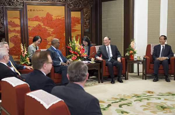 5月7日,中共中央政治局常委、中央纪委书记王岐山在北京中南海紫光阁会见参加第八届中美政党高层对话的美国民主党和共和党代表团。新华社记者 王晔 摄