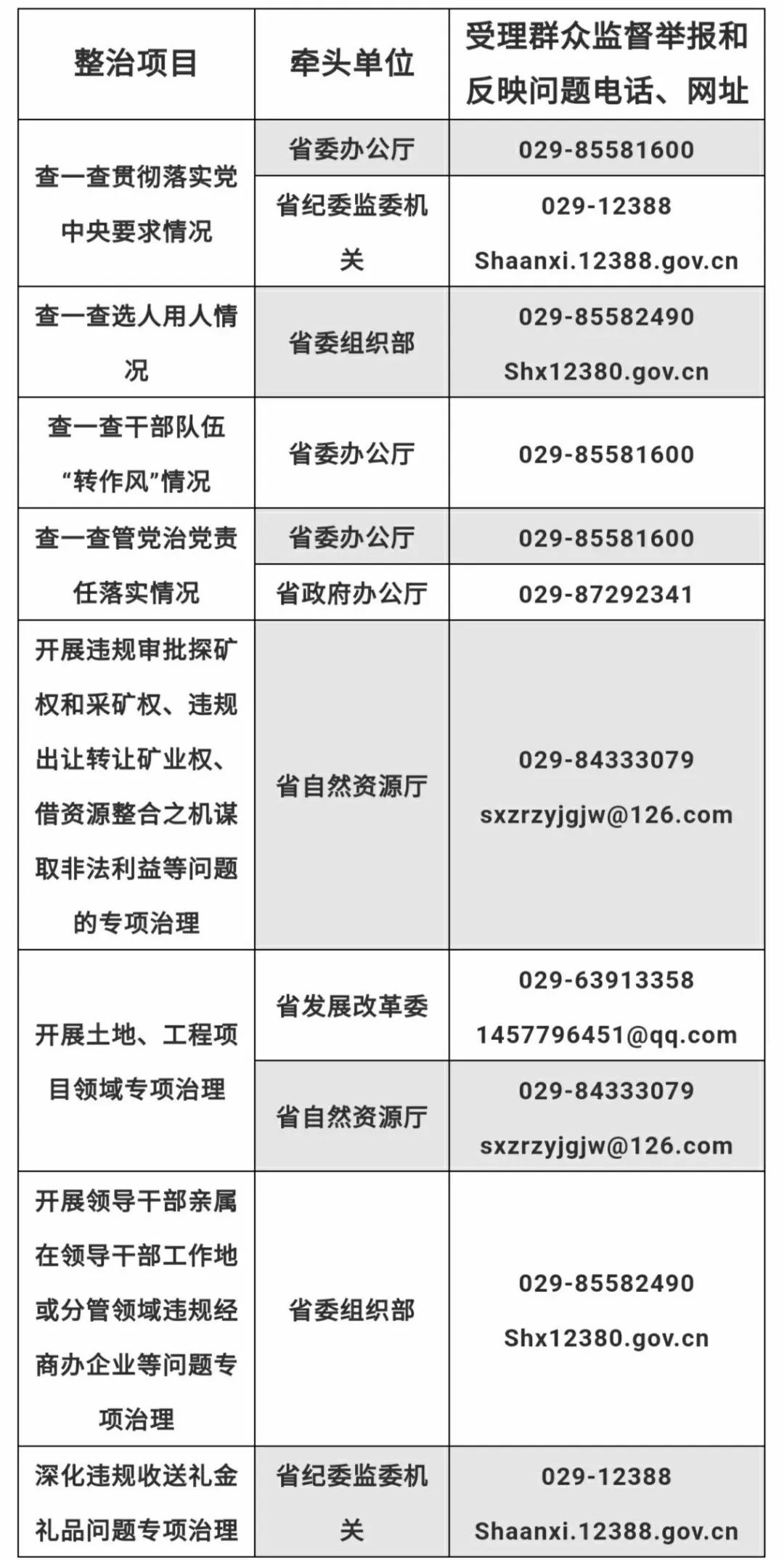 中共陕西省委肃清赵正永流毒和以案促改工作领导小组公布“四个查一查”和“四个专项工作”监督举报和反映问题方式