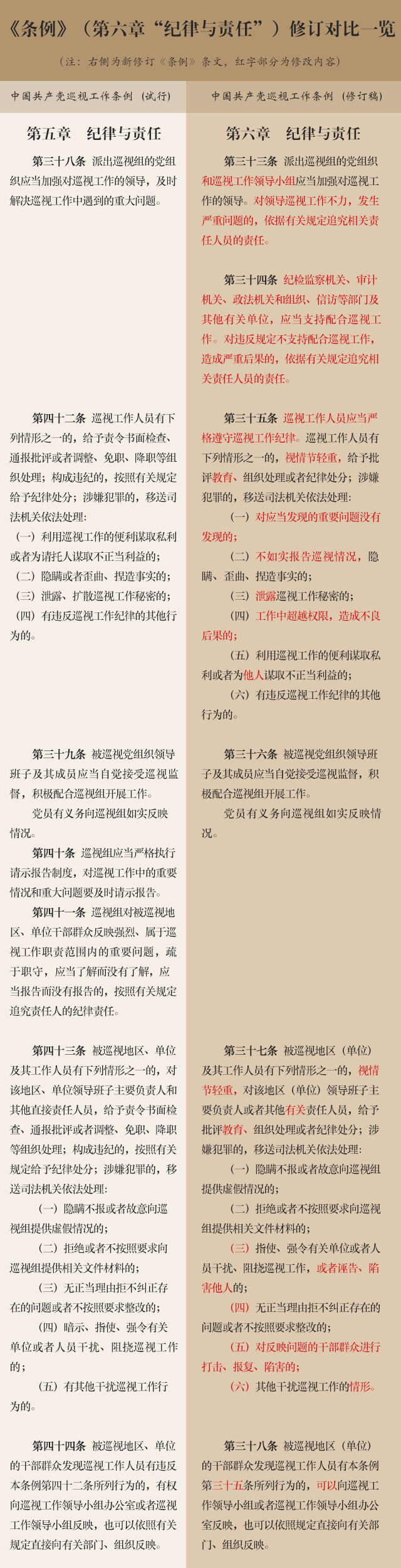 为进一步督促落实主体责任,《条例》明确“开展巡视工作的党组织承担巡视工作的主体责任”,并要求“派出巡视组的党组织和巡视工作领导小组应当加强对巡视工作的领导。对领导巡视工作不力,发生严重问题的,依据有关规定追究相关责任人员的责任。”这些具体要求,既使党委组织领导巡视工作有了明确规范和制度保障,又对领导不力、失职渎职行为严明了纪律。